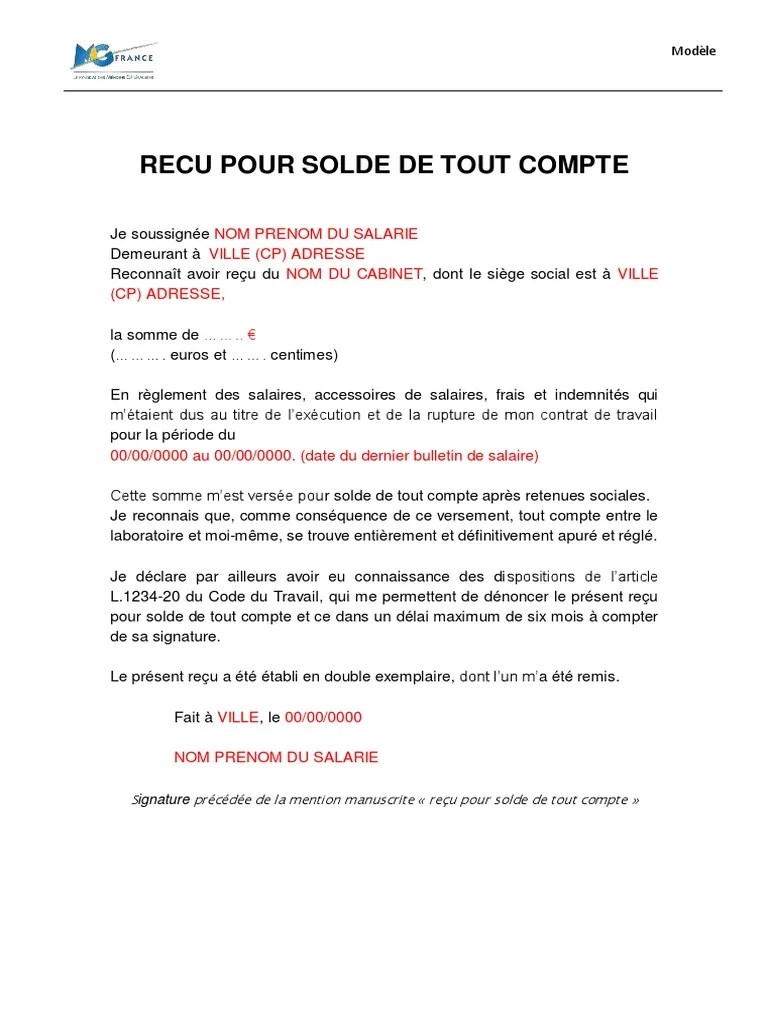 Mod?Le Solde De Tout Compte Cdi / Daily Posts Get 45 Exemple De Lettre De Demission. Retrouvez notre dossier complet sur le calcul du solde de tout compte (9 articles). Comment calculer le solde de tout compte ? Le solde de tout compte dans le cdi correspond à l'ensemble des sommes versées par l'employeur au salarié à la rupture du contrat de travail. Exemple de modèle d'un reçu pour solde de tout compte . Le contenu et la signature de ce document conditionnent les modalités de sa contestation par l'employé.